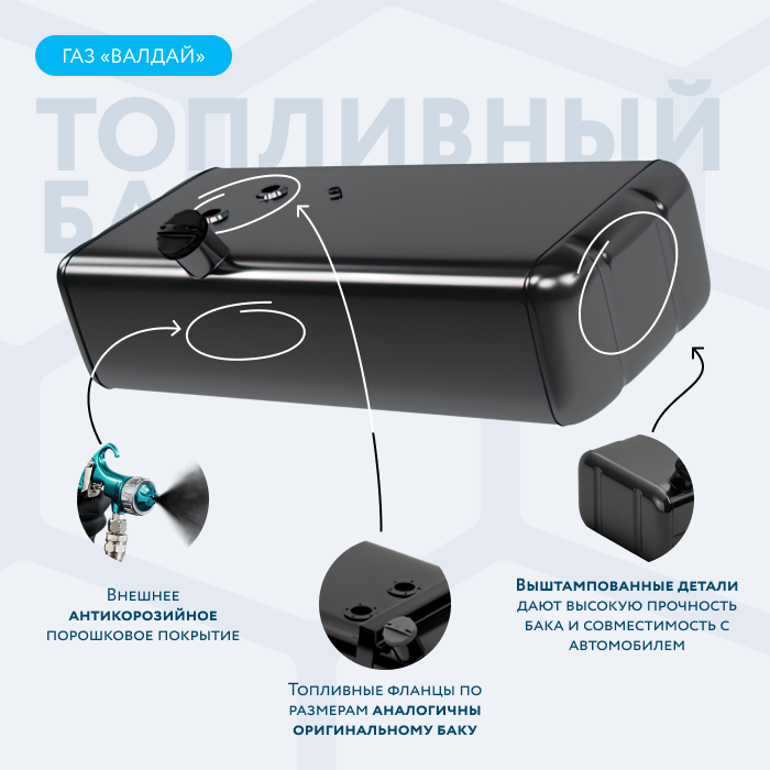 Топливный бак увеличенной ёмкости предназначен для установки на а/м Валдай (модификации ГАЗ-331042) и Газон Некст.