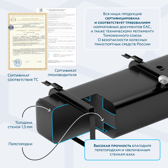 Бак изготовлен из стали толщиной 1,5 мм. Снаружи окрашен финской полимерно-порошковой краской. Продукция имеет паспорт и Декларацию таможенного союза. Гарантия - 1 год.