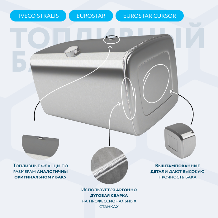 Алюминиевый бак не подвержен коррозии, что делает его более долговечным, а так же сбережет вашу топливную систему. Бак из алюминия в два раза легче стального бака, хотя он и изготовлен из листа увеличенной толщины в 2,5 мм. В конструкции предусмотрены цельные перегородки, которые проварены по периметру. Баки из алюминия так же оснащены заливной горловиной с самозапираемым непроливаемым клапаном (который становится барьером для разлива топлива, а так же становится защитой от попадания мусора в бак при открытой крышке) . Кроме того, однозначно что алюминиевый бак выглядит намного привлекательнее и дороже - где бак в том числе становиться и элементом тюнинга автомобиля. На алюминиеввые баки действует увеличенная гарантия - 36 месяцев.