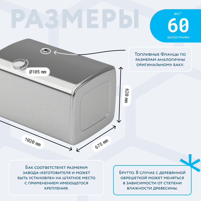 - Так же, если вы приобретаете алюминиевый топливный бак, он будет в деревянной обрешетке (для усиления защиты при транспортировке). При просчете веса и объема, цена за доставку может измениться по факту взвешивания на самом терминале транспортной компании. Так как деревянная обрешетка соответственно изготовлена из древесины, и она имеет свойство значительно набирать вес в зависимости от влажности окружающей среды.